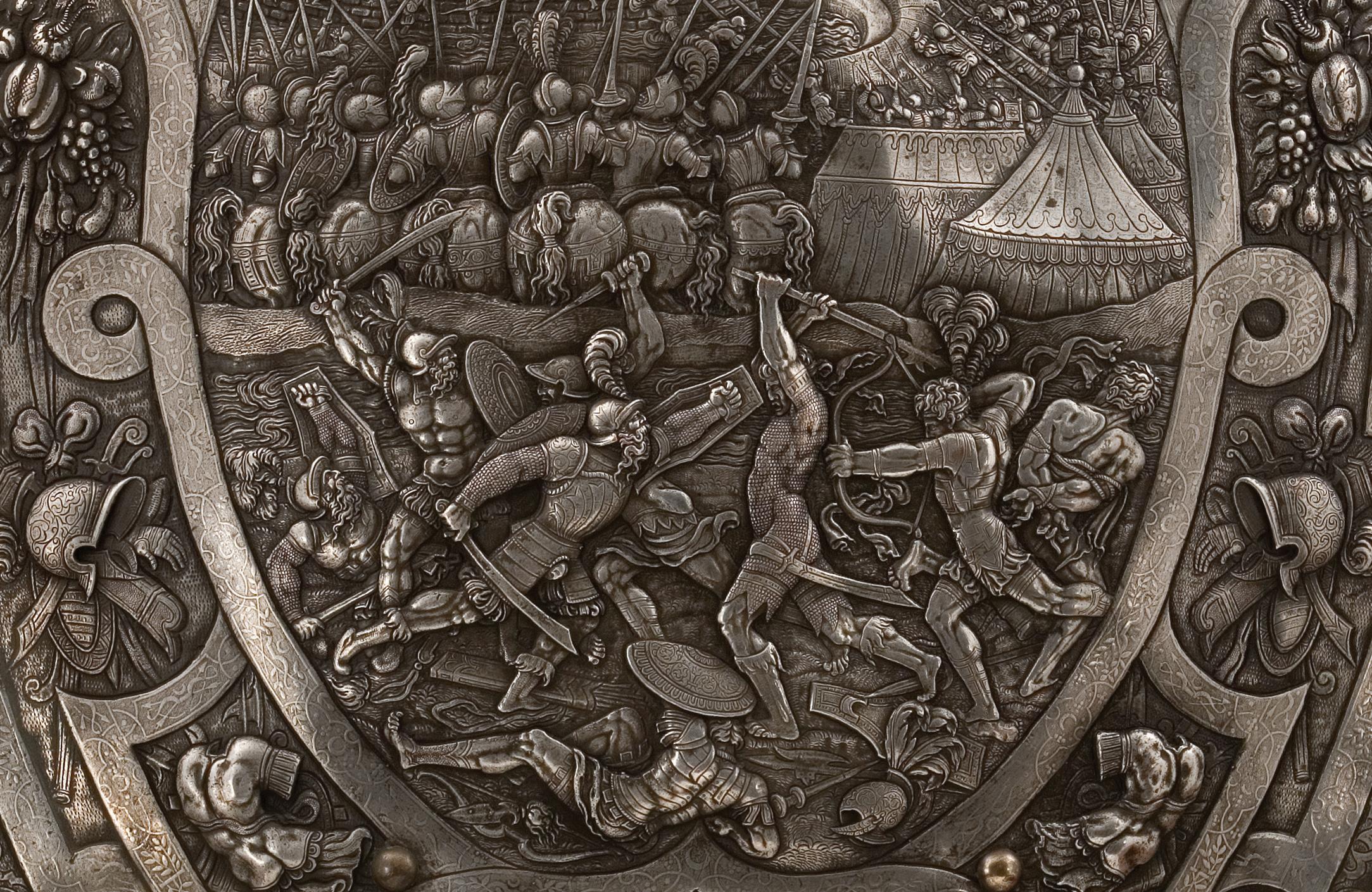 Parade Shield (detail), mid – late 19th Century. Electro-plating on copper, velvet; 25 9/16 × 18 1/8 × 2 3/8 in. On loan from Museo Stibbert, Firenze, Inv. no. armi1405.