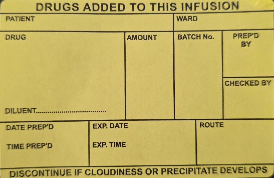 YELLOW LABELS: syringes, infusions, and docked bags must be labelled using a YELLOW additive label immediately after preparation by the person who prepared them.