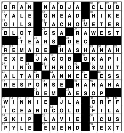 1 2 3 4 5 6 7 8 9 10 11 12 13 14 15 16 17 18 19 20 21 22 23 24 25 26 27 28 29 30 31 32 33 34 35 36 37 38 39 40 41 42 43 44 45 46 47 48 49 50 51 52 53 54 55 56 57 58 59 60 61 62 63 64 65 66 67 68 69 Across 1. High-fiber food 5. ____ Salerno-Sonnenberg (violinist) 10. Collection of members 14. Bulldogs' home 15. Beginning of the "Common Era" 16. Walk in the wild 17. Salad dressings' ingredients 18. Part of a dash 20. Ink stain 21. Fed. property management agency 22. Least refined 23. Crocodile ____ 25. Yr.'s end 26. Filmed a new version of 28. Rosh ___ 33. Devonshire river 34. Levi's father 36. African ruminant 37. Triangle tone 39. Pound 41. Lewd material 42. Union meeting spot 44. French year 46. Curvy letter 47. Answer 49. "LOL!" 51. Rep.'s rival 52. Ancient moralist 53. ____ Cooper, "The Wonder Years" girl next door 57. DC Comics superhero team (abbr.) 58. Composer Carl 61. Winter weather report, perhaps 63. Italian sportswear company 64. Uno card 65. " ___ en Rose" 66. Hosp. sections 67. TV's Gomer 68. Change, as text 69. Printed matter