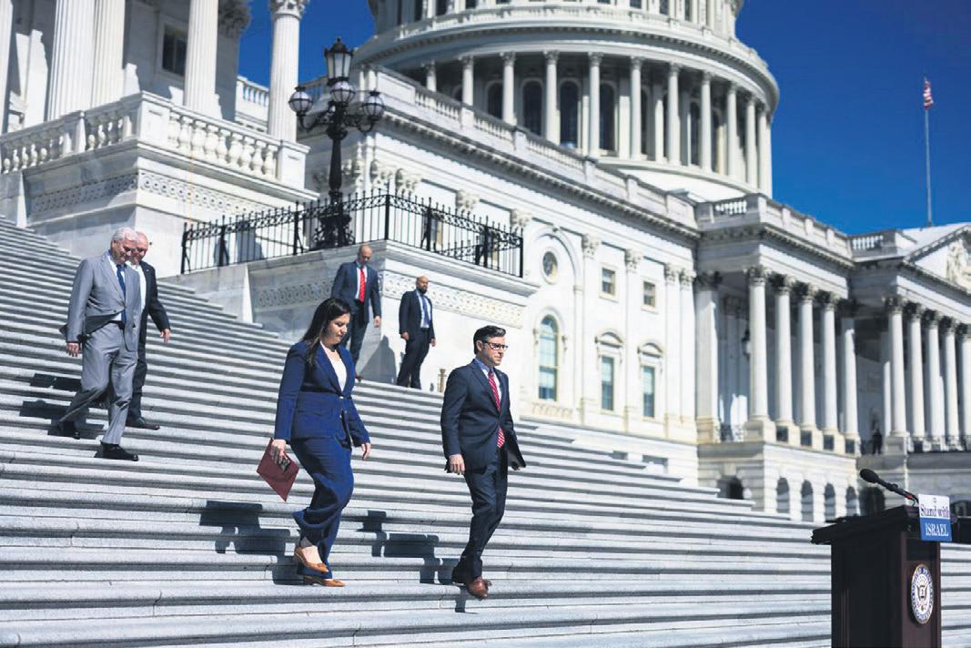 House Speaker Mike Johnson (R-La.) arrives for a news conference outside the Capitol in Washington, May 16, 2024. A successful bipartisan effort to force a vote on disaster relief is just the latest example of how procedural norms have been upended in the House. (Tierney L. Cross/ The New York Times)