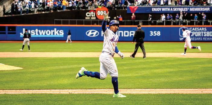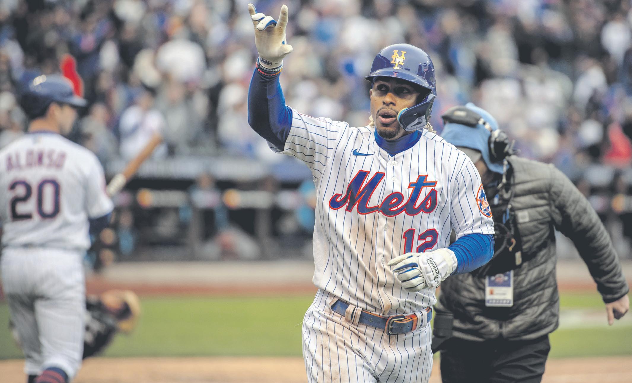 New York Mets shortstop Francisco Lindor celebrates his home run against the Florida Marlins at Citi Field in Queens on Friday, April 7, 2023. News over the weekend that team captain Lindor and at least seven other Team Puerto Rico players had been denied insurance coverage to play in the World Baseball Classic was received with shock and dismay on the island. (Hilary Swift/The New York Times)