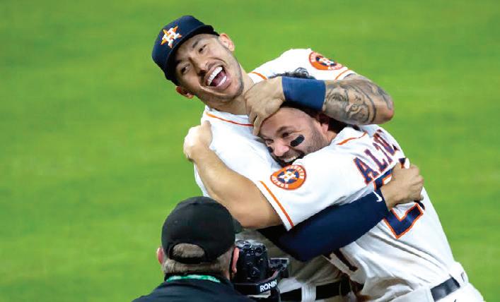 Houston Astros’ Carlos Correa (1) and José Altuve (27) celebrate after winning Game 6 of the American League Championship Series against the Boston Red Sox at Minute Maid Park in Houston, Friday, Oct. 22, 2021. Correa was not cleared by Major League Baseball’s insurer to play in the World Baseball Classic, although his case, along with other players’, is said to be under review. (Annie Mulligan/The New York Times)