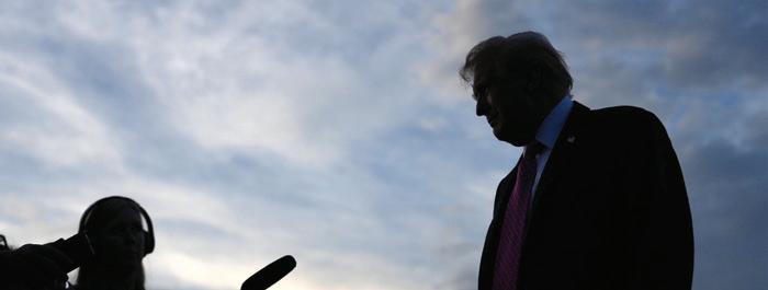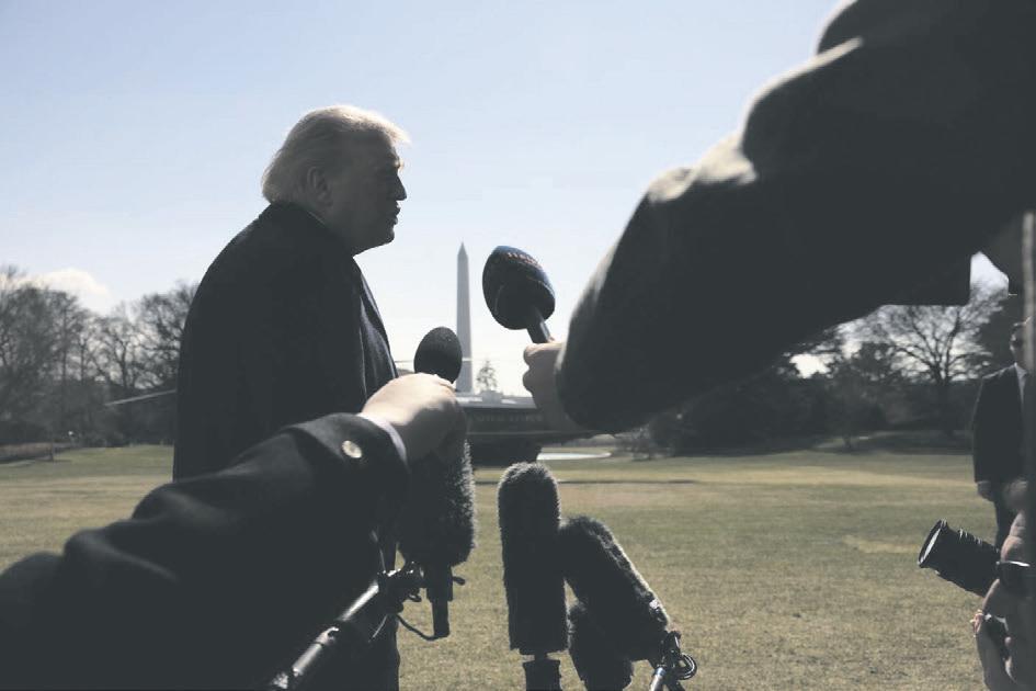 President Donald Trump speaks to reporters outside of the White House in Washington, on Friday, Feb. 27, 2026. A decade after propelling himself to the highest office by promising to focus on “America first,” President Trump has become increasingly willing to assert power overseas. (Anna Rose Layden/The New York Times)