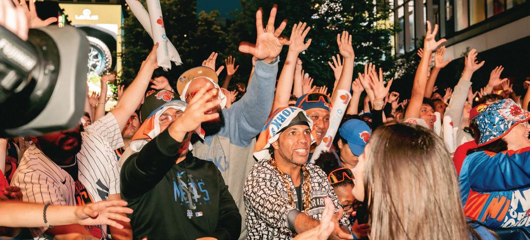 New York Knicks fans celebrate at an NBA playoff watch party outside Madison Square Garden in New York, May 17, 2025. Sports events and concerts offer more opportunities than ever to reach for free keepsakes, but several recent episodes raise a question: Is fan behavior getting worse as a result? (Ye Fan/The New York Times)
