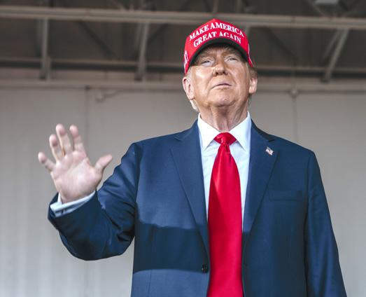 Former President Donald Trump, the Republican presidential nominee, campaigns at the Dodge County Airport in Juneau, Wis., Oct. 6, 2024. Eight years ago, Trump’s politics of grievance won over many white voters. Now, he hopes to make inroads with Black and Latinos by stoking resentments and pointing to scapegoats. (Jamie Kelter Davis/The New York Times)