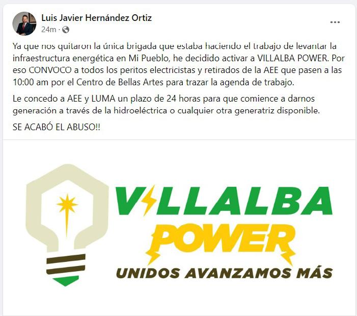 “Since they took away the only brigade that was doing the work of raising the energy infrastructure in Mi Pueblo, I have decided to activate VILLALBA POWER,” Hernández Ortiz, who is also the president of the Puerto Rico Mayors Association, wrote on his Facebook page. “Therefore, I CALL on all electrical experts and retirees of PREPA to come to the Fine Arts Center at 10:00 a.m. to outline the work plan. I grant PREPA and LUMA 24 hours to start giving us generation through hydroelectric or any other available generator. THE ABUSE IS OVER!”
