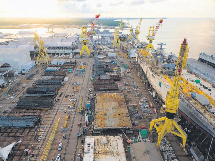 Asymphony of sorts echoed through the sprawling shipyard on the Gulf Coast of Mississippi — banging, hissing, beeping, horns, bells and whistles — as more than 7,000 workers hustled to fill orders fueled by the largest shipbuilding budget in the Navy’s history.