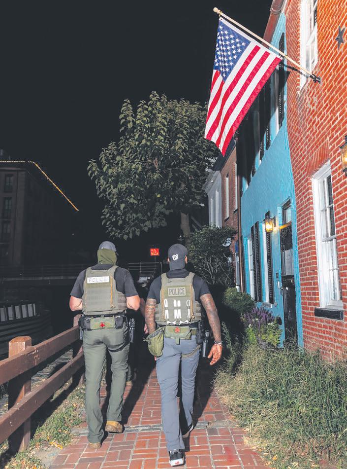 Officers with the U.S. Drug Enforcement Administration (DEA) and other federal agencies on patrol in the Georgetown neighborhood of Washington on Tuesday night, Aug. 12, 2025. National Guard troops and federal law enforcement agents began to deploy in Washington on Tuesday evening as President Donald Trump’s plan to use the federal government to crack down on crime in the city started taking shape.