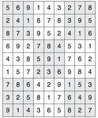 Every 3x3 square must contain the numbers from 1 through 9