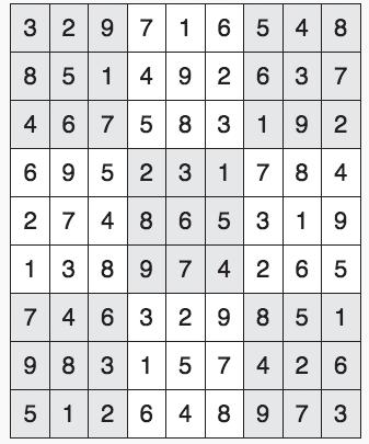 Every 3x3 square must contain the numbers from 1 through 9