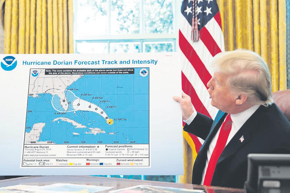 President Donald Trump shows a National Oceanic and Atmospheric Administration forecast track of Hurricane Dorian that was altered with a black marker, at the White House in Washington, Sept. 4, 2019. NOAA has been ordered to identify grants related to global warming and other topics targeted by Trump’s executive orders, raising fears that those grants are at risk of being canceled. (Erin Schaff/ The New York Times)