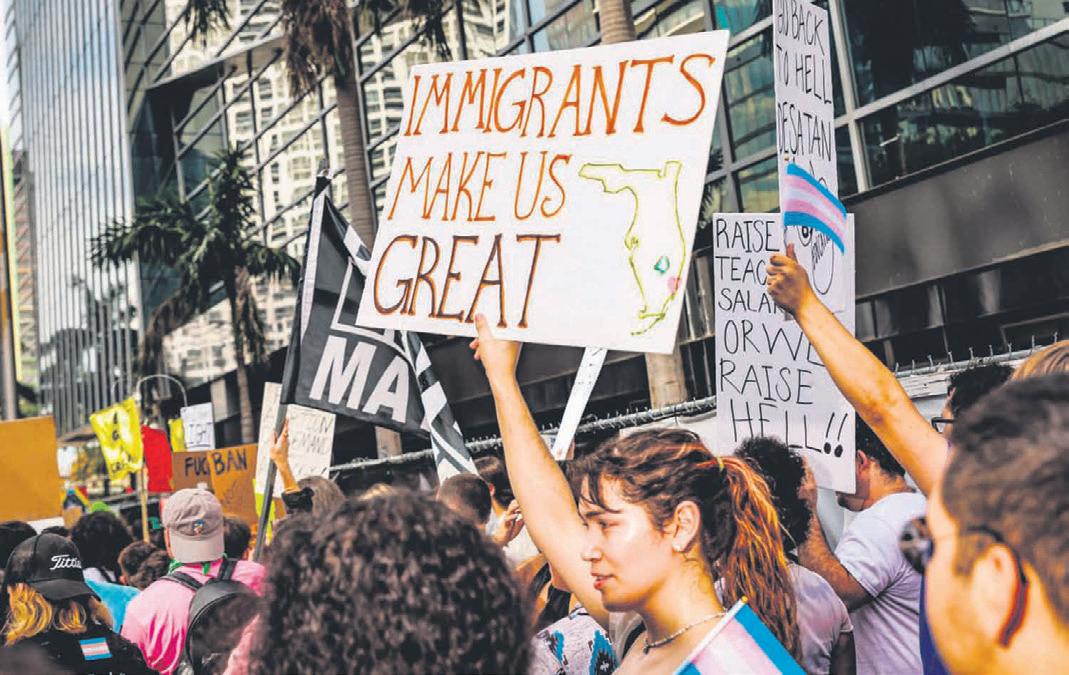 A pro-immigration demonstration outside a fundraiser in Miami for Gov. Ron DeSantis at the onset of his 2024 presidential campaign, on May 24, 2023. Ileana Garcia, a Republican state senator in Florida, is hoping the White House reconsiders its harsh immigration enforcement tactics. “I do think that he will lose the midterms because of Stephen Miller,” she said. (Scott McIntyre/The New York Times) The
