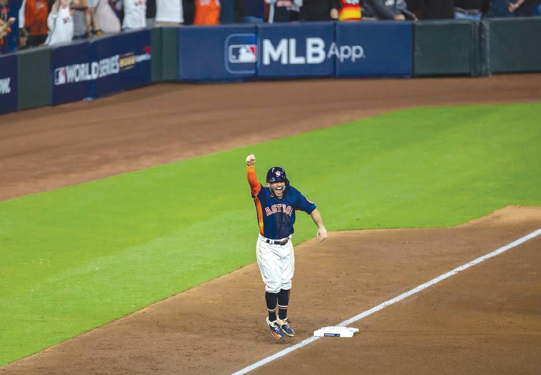 The Houston Astros’ José Altuve celebrates teammate Yordan Alvarez’s towering three-run homer to center to put the Astros up 3-1 in the sixth inning of Game 6 of the World Series, at Minute Maid Park in Houston on Nov. 5, 2022. Ahead of his 15th season with the Astros, Altuve’s transition to left field is underway. (Annie Mulligan/The New York Times)