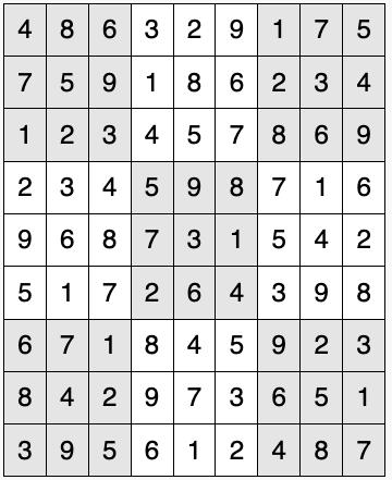 Every 3x3 square must contain the numbers from 1 through 9