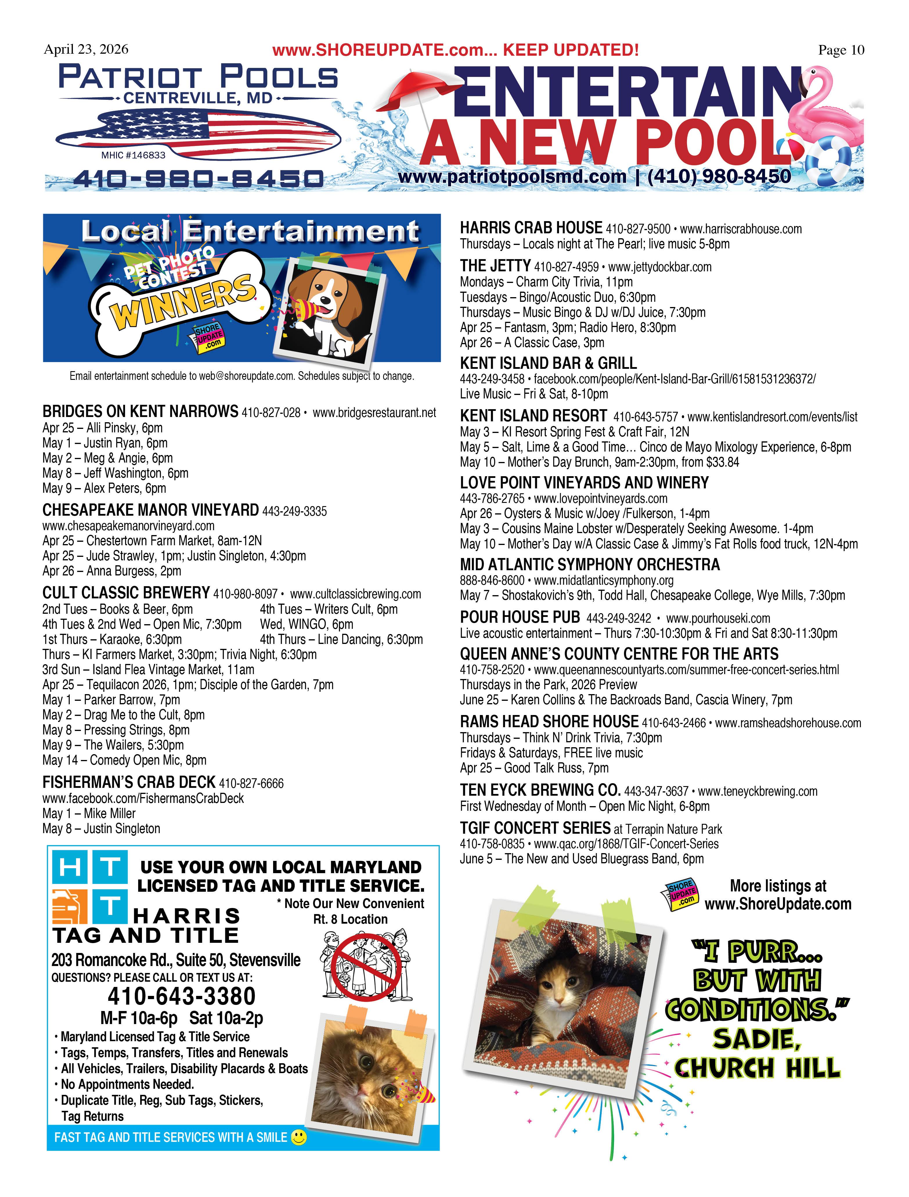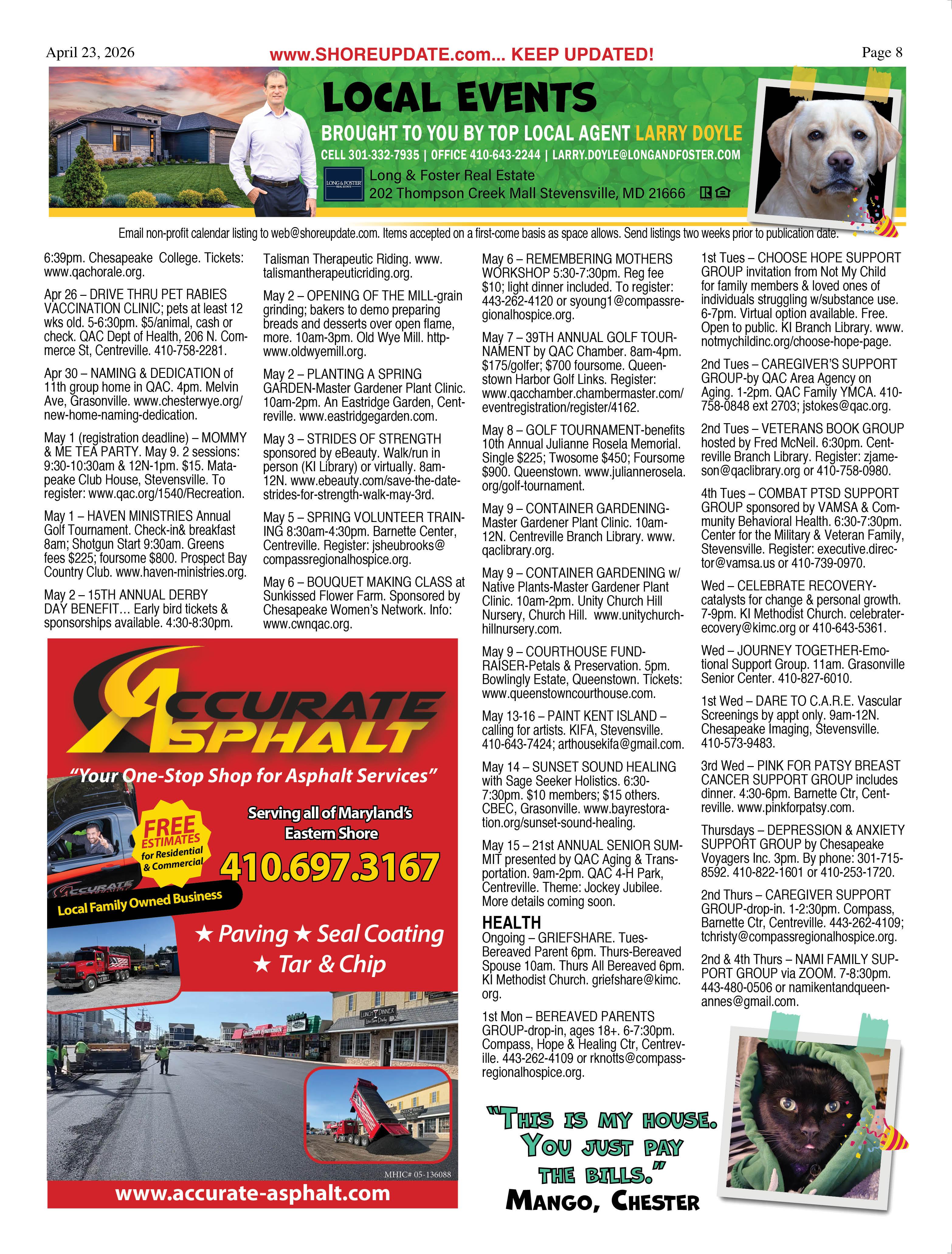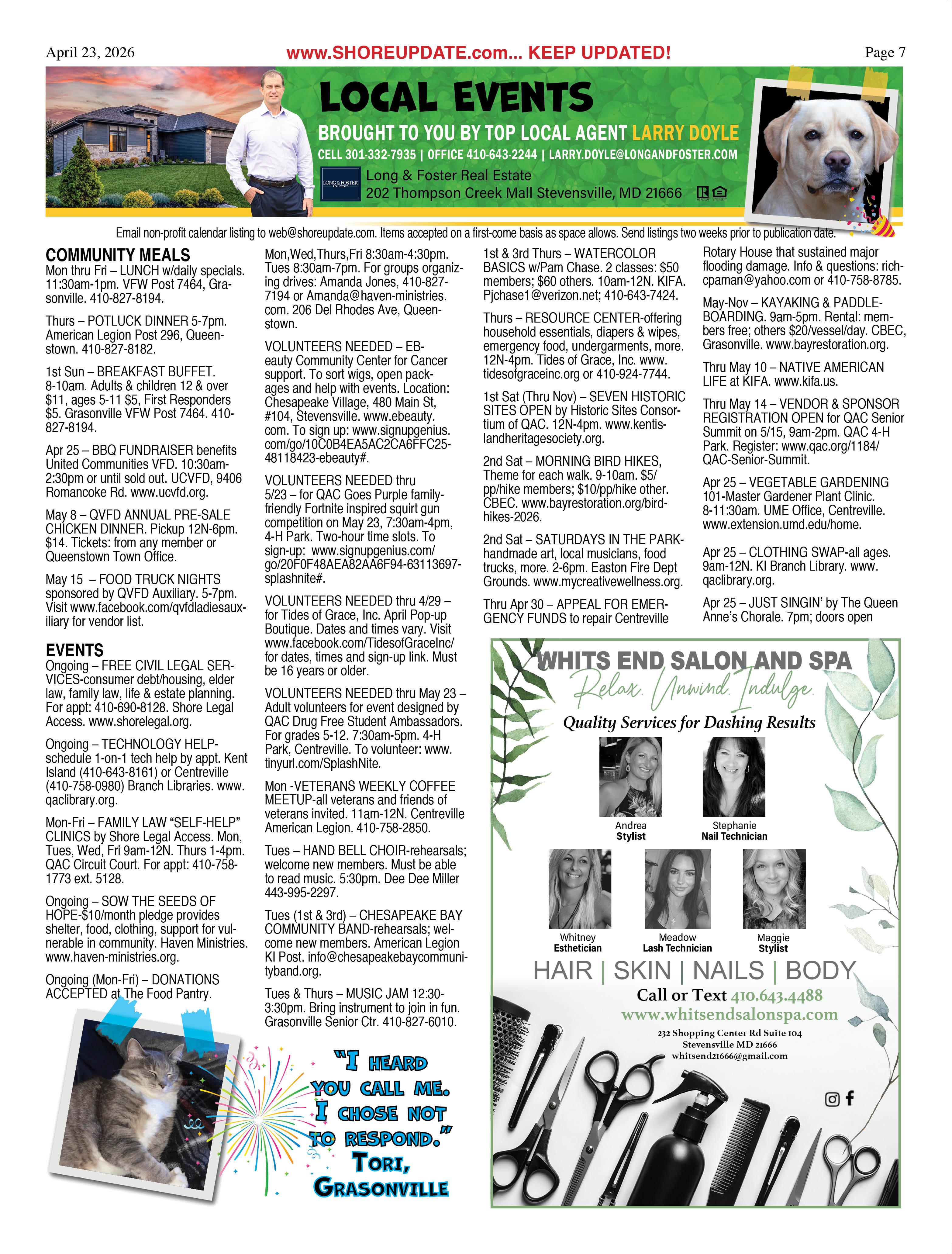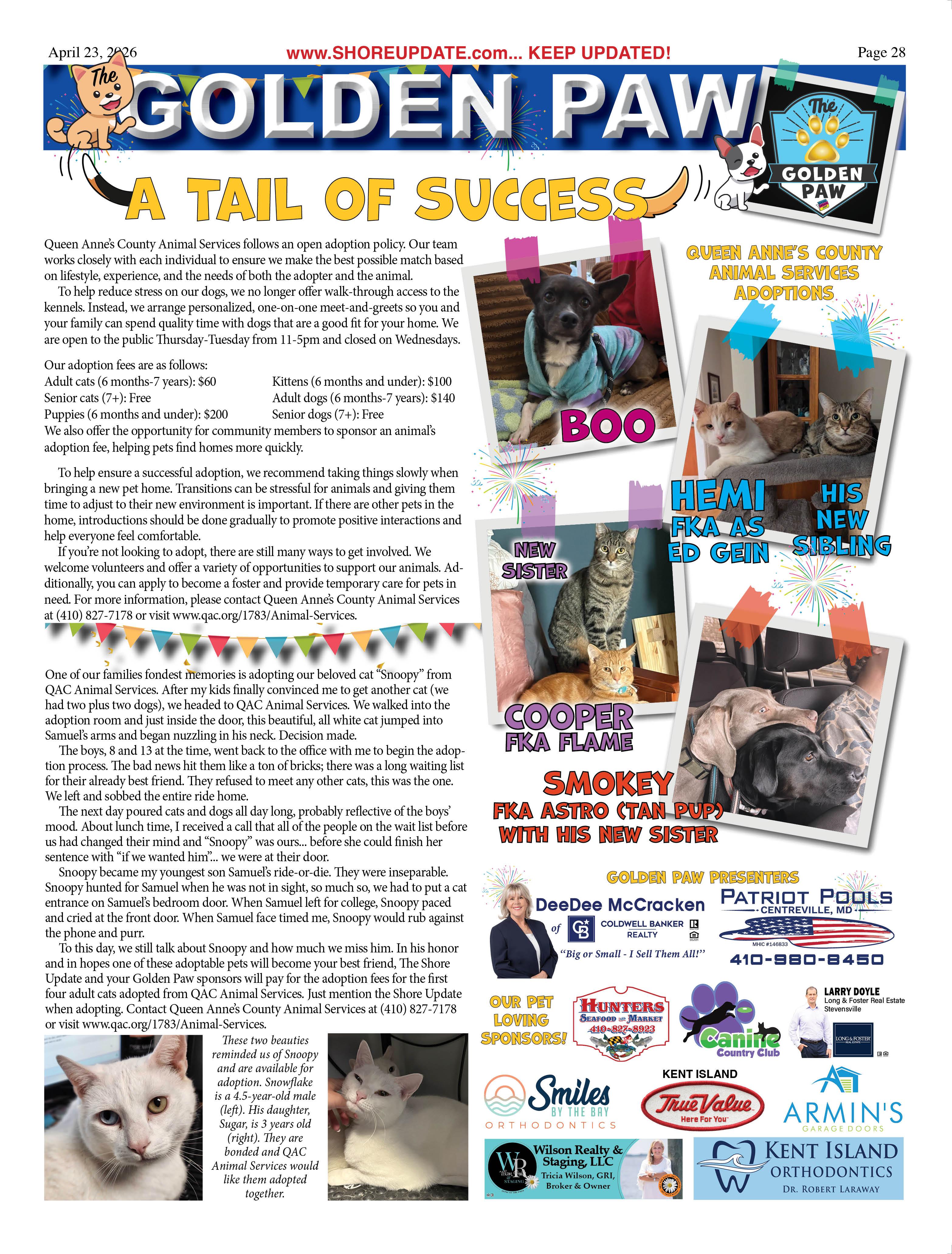 •Queen Anne’s County Animal Services, 201 Clay Drive, Queenstown. 410827-7178, www.qac.org/1425/Animal-Services.