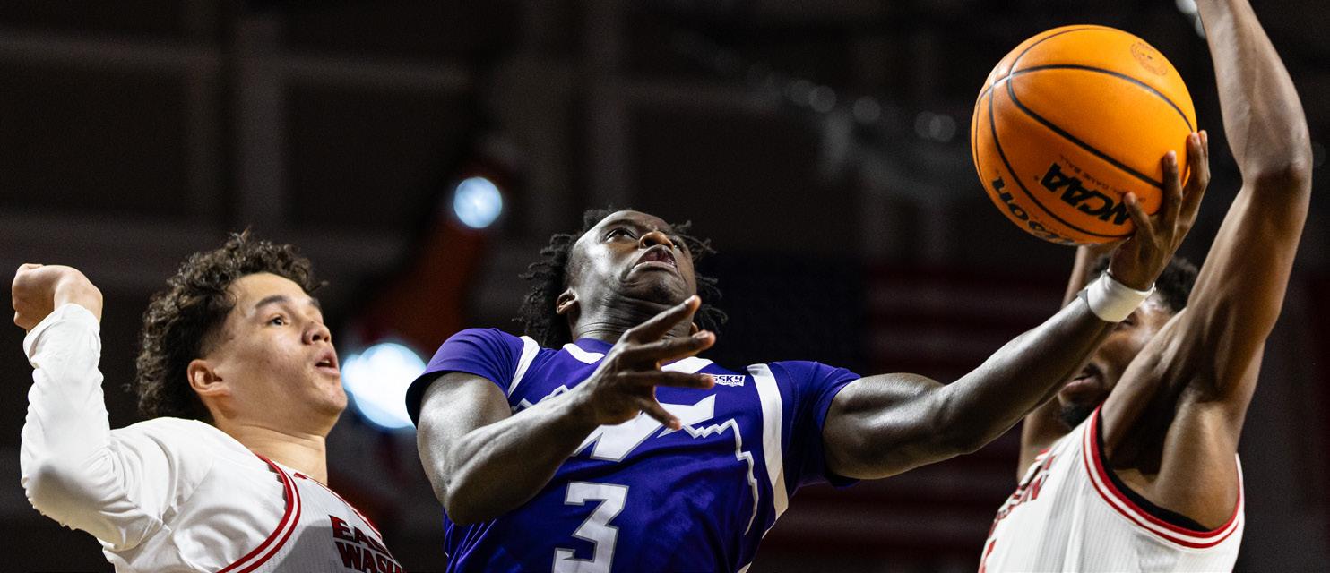Tijan Saine Jr. (n.º 3) intenta anotar en el partido del torneo de baloncesto masculino de la Big Sky Conference contra la Universidad de Eastern Washington, celebrado en el Idaho Central Arena el 9 de marzo en Boise, Idaho.