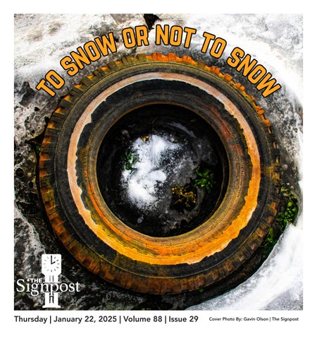 TOP LEFT: Frost and snow cover a row of trees along the sides of a walkway beside Elizabeth and Tracy Hall in the winter of 2025.