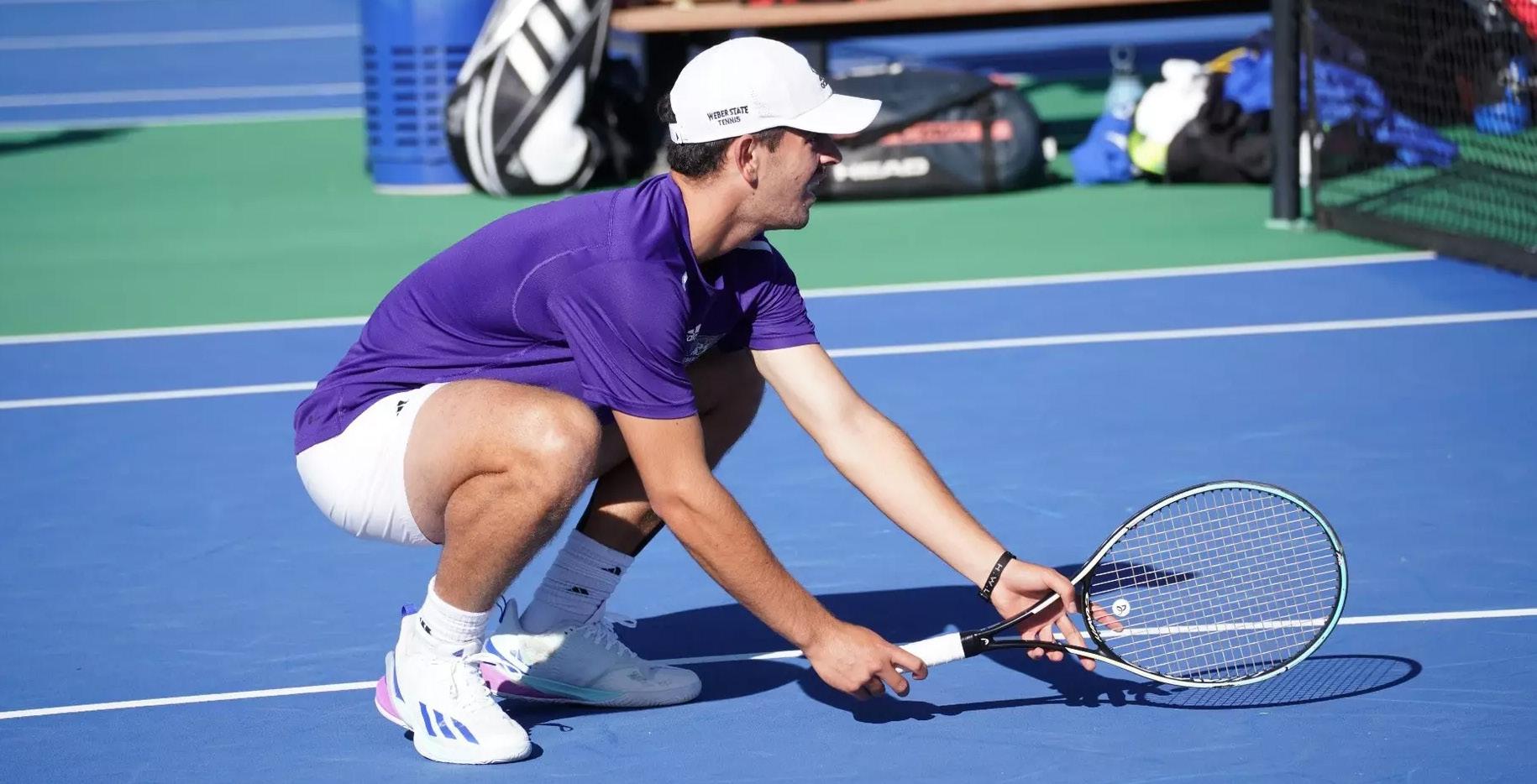 ARRIBA: El tenista masculino de la Universidad Weber State, William Zulch, agachado en la pista de tenis entre dos servicios.