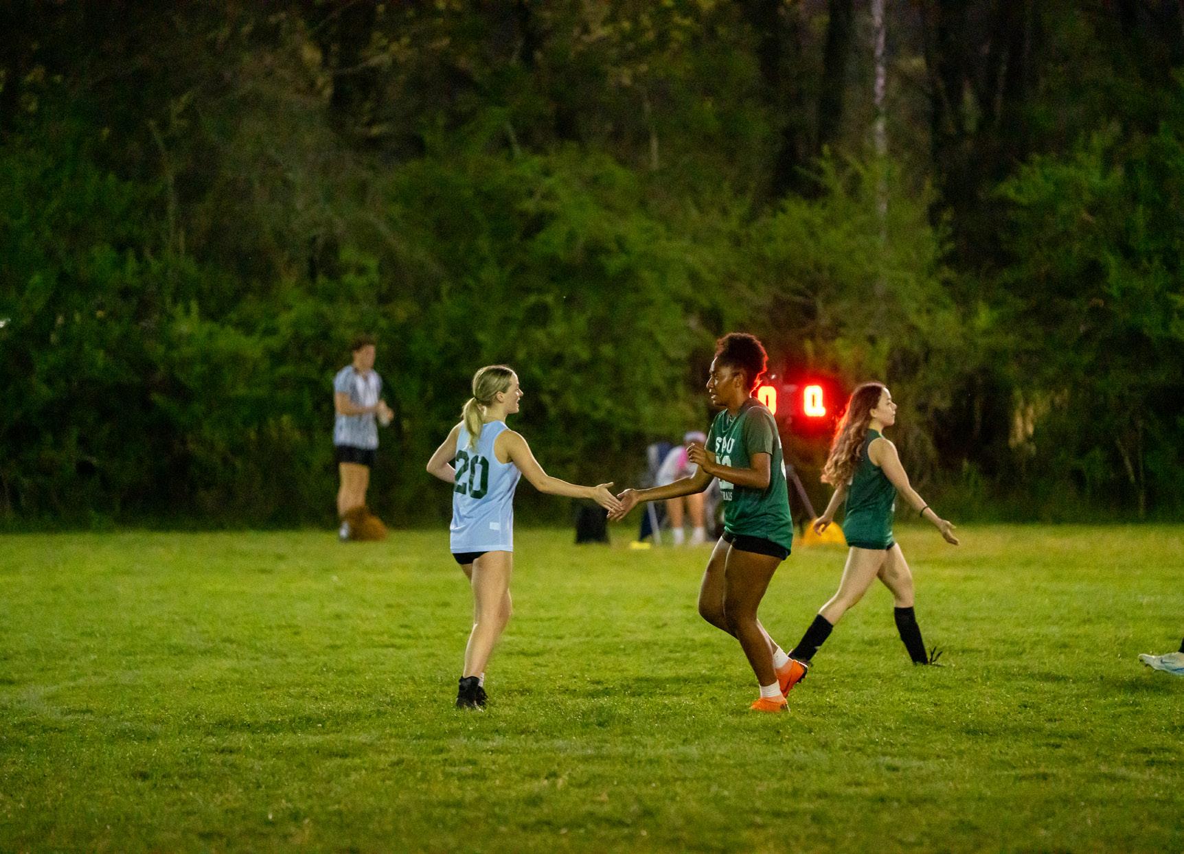 Kate Brosseuk high fives a friend on the opposing team. Thursday, April 3, 2025 (Photo by Elias Zabala)