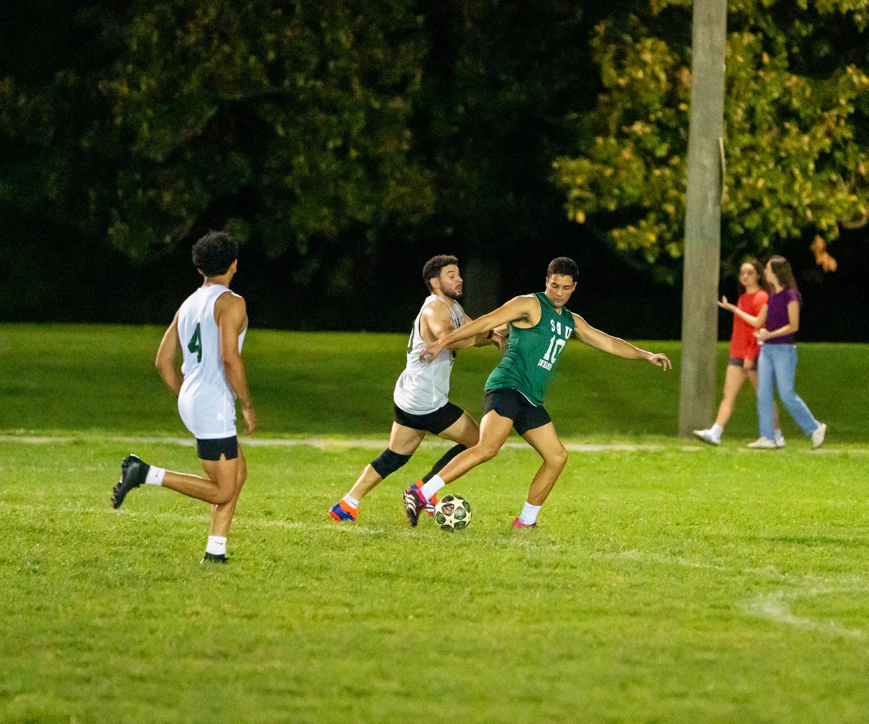 Players rally around the soccer ball, waiting for a chance to steal the ball. Thursday, April 3, 2025 (Photo by Elias Zabala)