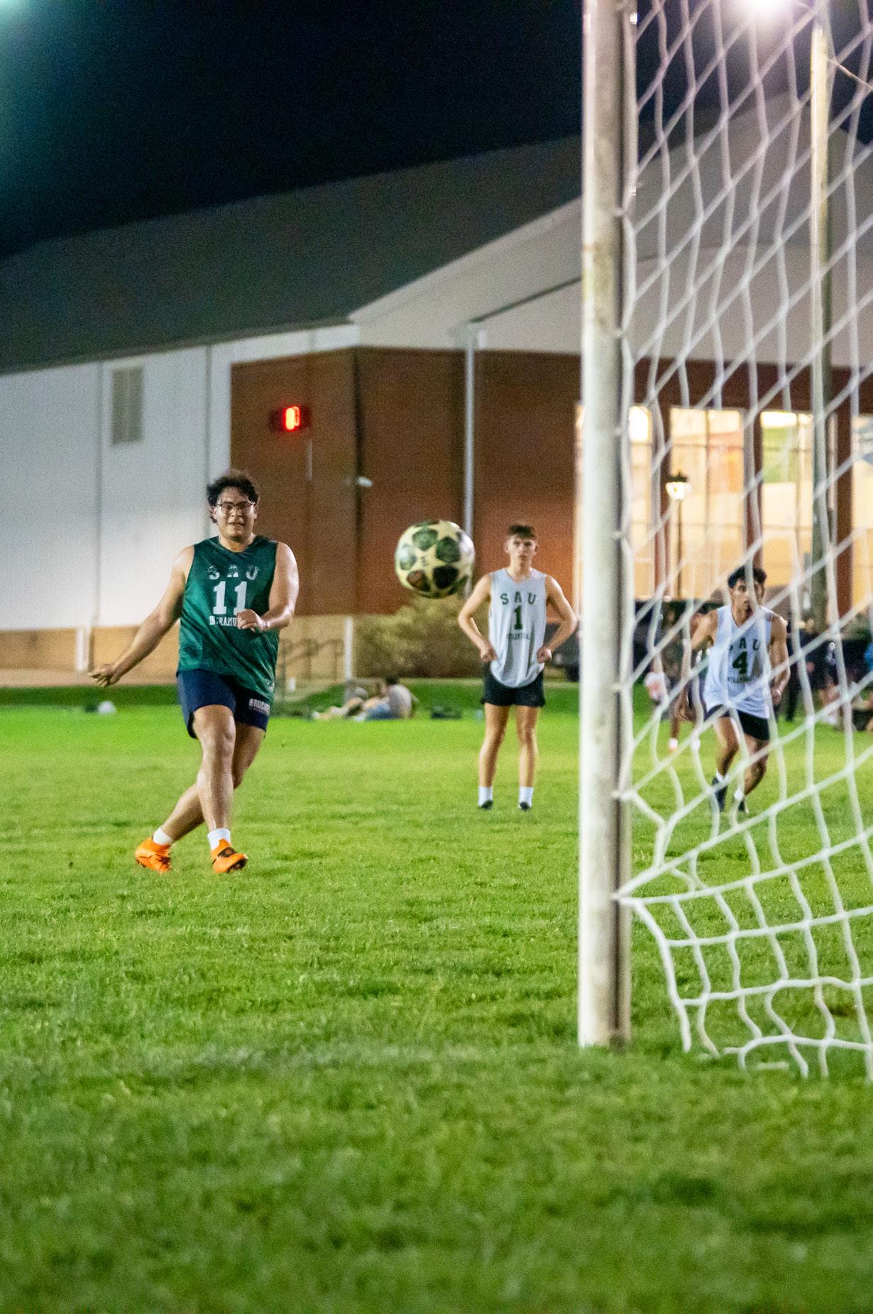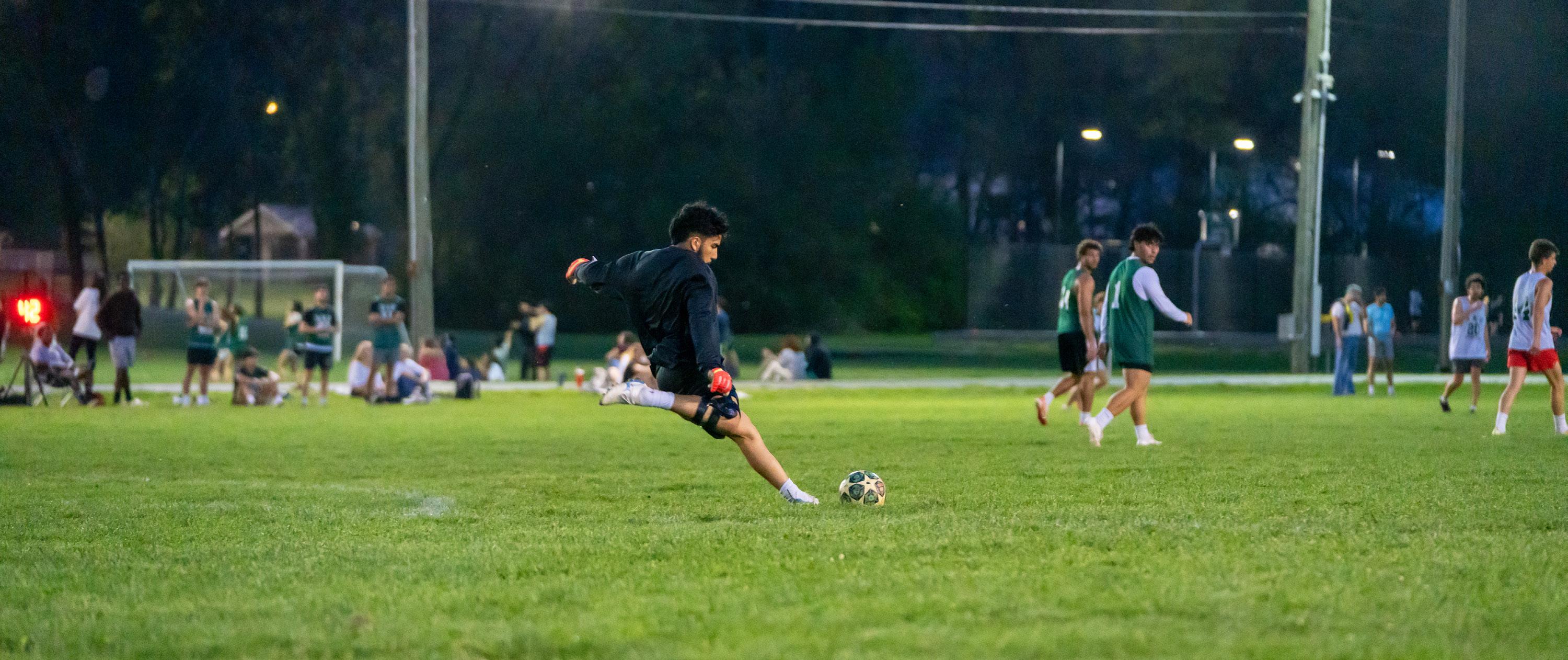 Student goalie prepares to kick the ball across the field. Thursday, April 3, 2025 (Photo by Elias Zabala)
