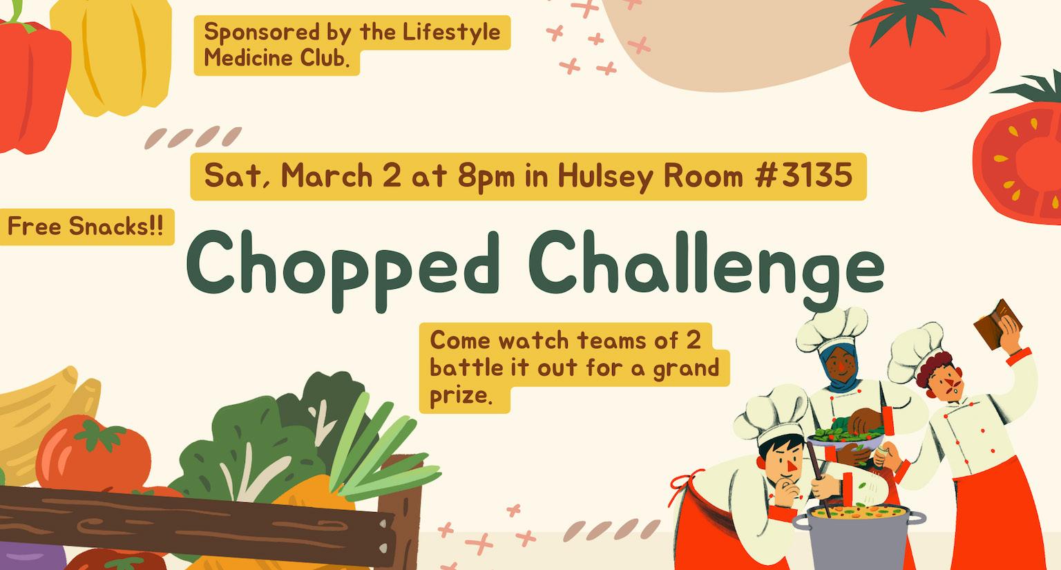 On Saturday, March 2, at 8 p.m, the Lifestyle Medicine Club will host a “Chopped Challenge” in Hulsey Room 3135. This challenge will be based on the popular Food Network TV game show “Chopped,” where four chefs face off against each other by making a meal out of mystery items in their basket for the chance to win a cash prize.