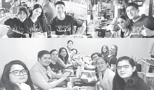 TOURING THE CITY. The ABS-CBN artists went to di erent areas in Singapore for a quick tour and to have sumptuous meals. (Top) MOR 101.9 DJ Eva Ronda, Jayda Avanzado, Darren Espanto, Bugoy Drilon, KZ Tandingan, and Robi Domingo at El Lamesa, (bottom) while folk-pop band Ben & Ben are at Don Lechon.