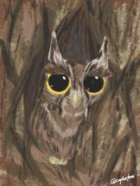 An owl camouflaged against a tree trunk. (Illustration by the author's daughter, Yumi Burgos.)
