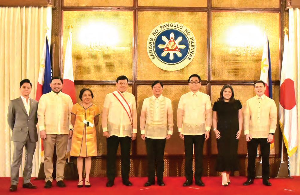 JAPAN HONORS VILLAR. President Ferdinand Marcos Jr. (center) is flanked by Manuel “Manny” B. Villar Jr. and Japanese Ambassador Kazuhiko Koshikawa after the latter, on behalf of His Majesty the Emperor of Japan, conferred upon the former Senate President and House Speaker the Grand Cordon of the Order of the Rising Sun at Malacañang on Friday. Also in picture (from left) are Senior Deputy Speaker Sandro