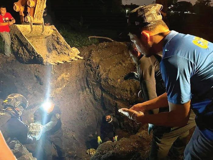 WEAPONS SEARCH. Operatives from the Criminal Investigation and Detection Group dig up a portion of the HDJ Tolong sugar mill compound in barangay Caranoche, Sta Catalina, Negros Oriental on Sunday as they look for weapons following a tip from an informant. They previously recovered high-powered weapons, ammunition, and P18 million in cash from the sugar mill (see photos on A2). PNP CIDG Photo