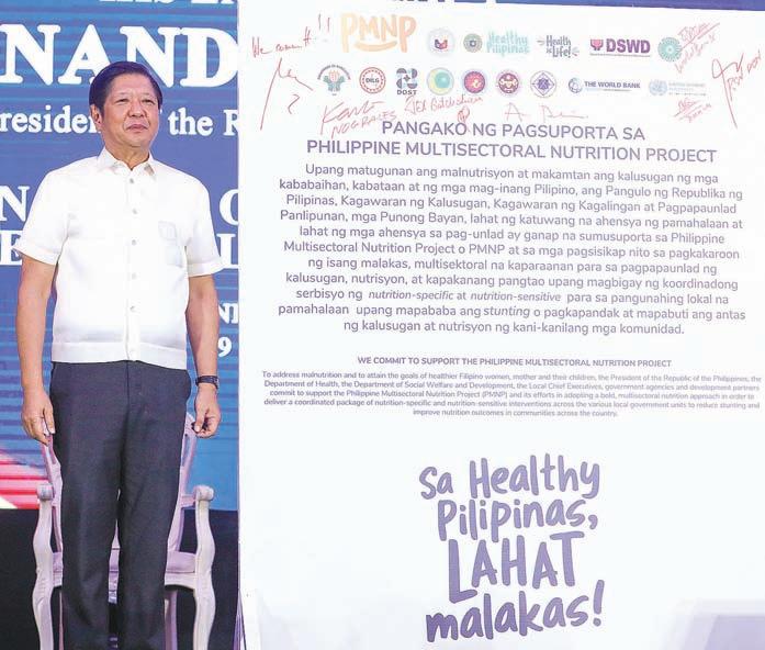 President Ferdinand Marcos Jr. affixes his signature on a manifesto of commitment for the Philippine Multisectoral Nutrition Project during its launching on Wednesday, March 29, 2023. The PMNP, a four-year project spearheaded by the Department of Health and the Department of Social Welfare and Development, is geared toward adopting a bold and multisectoral approach to achieve nutrition-specific and nutrition-sensitive interventions across various local government units. Alfred Frias
