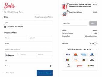 One of the fraudulent pages discovered lures users with special offers on Barbie dolls coinciding with the movie launch. Besides the regular dolls, users are being enticed to buy limited-edition movie-related dolls, including one of the lead actress Margot Robbie for around 12 pounds sterling. They can add a helicopter for £56, making the total cost of the purchase £60 (with an “exclusive” discount). However, once users decide what to buy, they are redirected to a purchase form that requires personal identification details such as