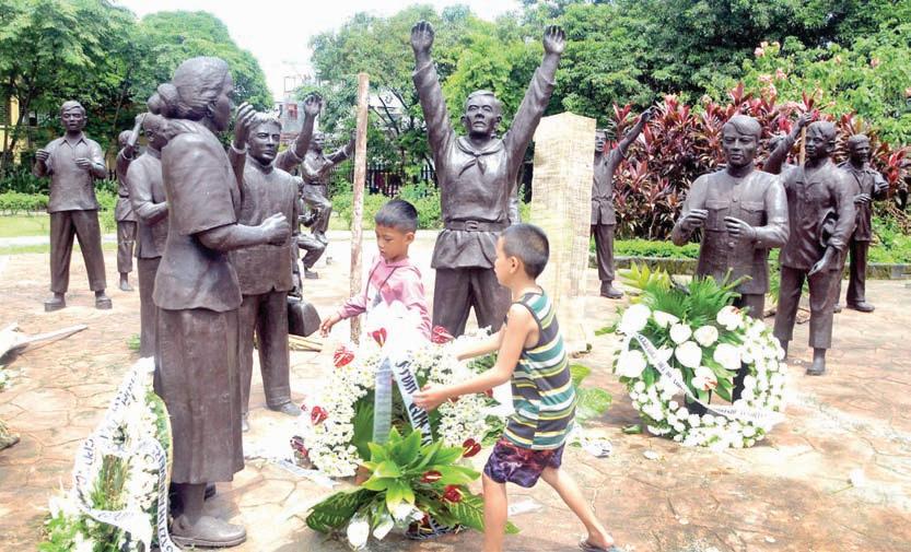 FOR FREEDOM FIGHTERS. Children arrange flowers at the Pugad Lawin Shrine in Quezon City over the weekend ahead of National Heroes Day on Monday, Aug. 28, 2023. Manny Palmero