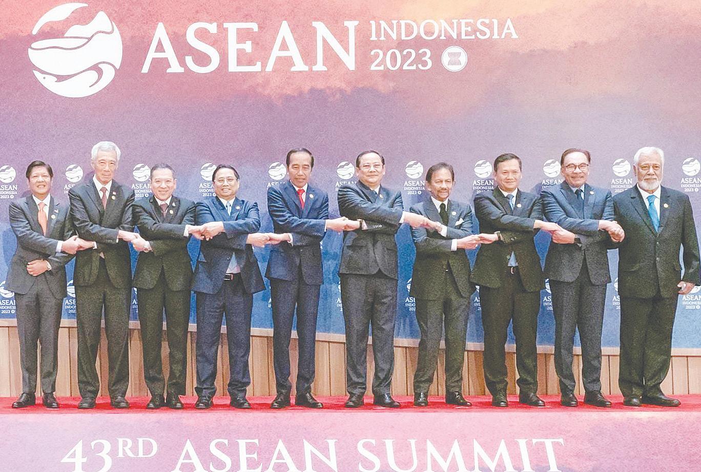 ASEAN PRESENCE. President Ferdinand Marcos Jr. (left) joins hands with the other leaders of the Association of Southeast Asian Nations for their traditional pose at the start of the 43rd ASEAN Summit in Jakarta, Indonesia. PCO Photo PRICE CEILING SET. A store retailer displays regular milled rice sold at P41