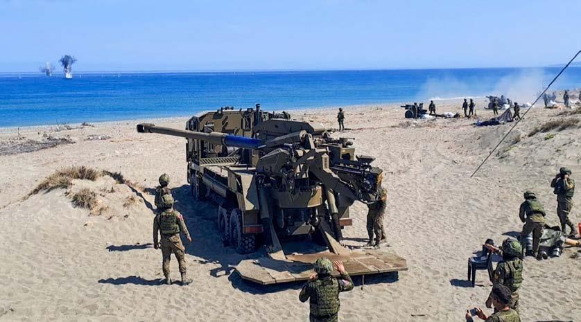 US troops massed at a strip of sand dunes at the northwest coast of Luzon, around 400 kilometers south of Taiwan, and fired more than 50 live 155mm howitzer rounds at floating targets five kilometers off the coast.