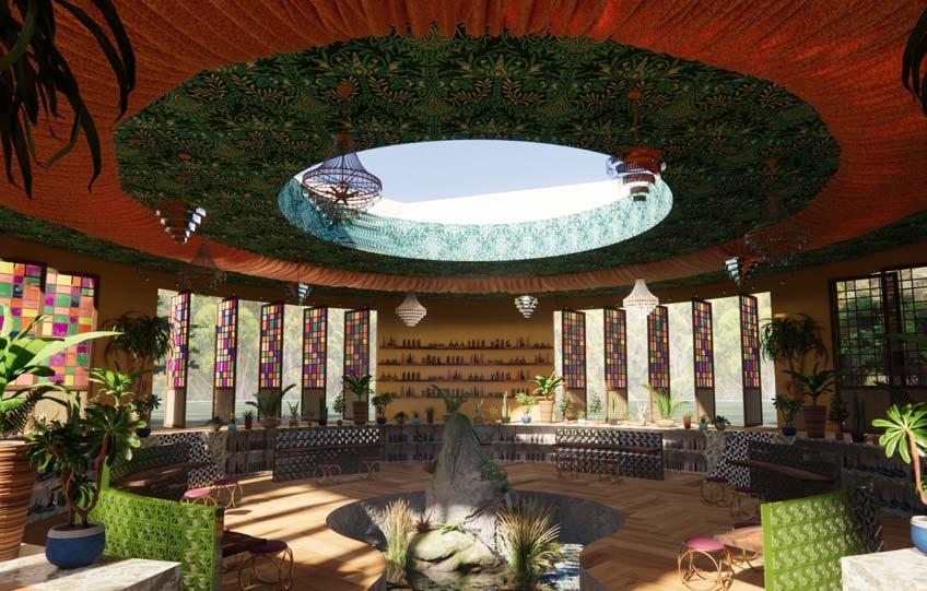 To promote sustainability, the layout incorporated open areas and low-emissivity film-coated glass panels to regulate indoor temperature. It utilized renewable materials such as Aria lightweight mineral coating furniture, natural woods, and rattan accent veneers for wall panels and ceilings.