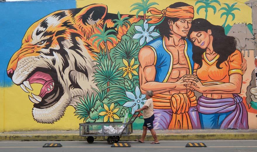 MURAL. A resident passes by a mural in Mandaluyong City’s ‘Sining Wall’ in the street. The mural depicts the struggle of Filipinos during hardships. Lino Santos