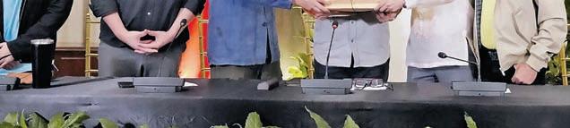 QUAD COMM FINDINGS. House Quad Committee Chairpersons Reps. Robert “Ace” Barbers, 4th from left, Dan Fernandez, 3rd from left, and Joseph Stephen Paduano, 7th from left, hand over yesterday the committee documents to Assistant Solicitor General Hermes Ocampo, 5th from left, at the House of Representatives. They urged the Office of the Solicitor General to initiate legal actions against Chinese nationals accused of using fraudulent