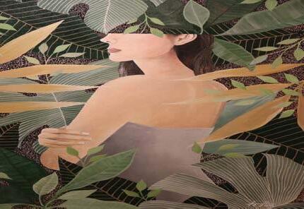 Many of her pieces depict women set against backdrops filled with greenery, reinforcing the idea that personal growth—like the changing seasons— follows its own rhythm.