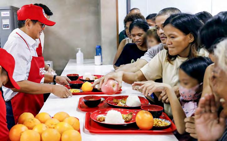 President Marcos, wearing the red apron and cap of WGK volunteers, distributed rice, meat, noodles, soup, vegetables, and fruit to clients of the kitchen before sitting down to share the meal.