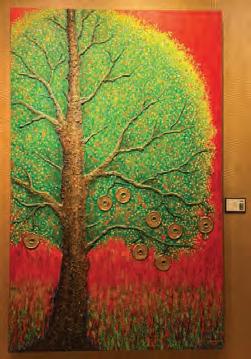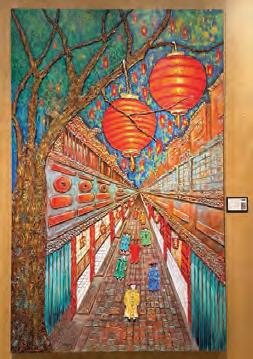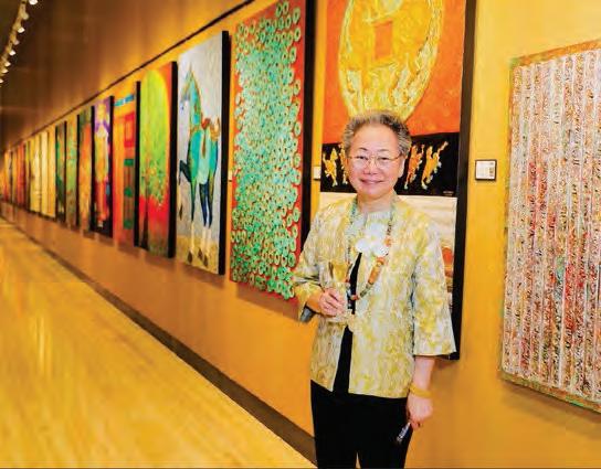 Lizanne’s works stand out in their authenticity and are deeply rooted in her ChineseFilipino heritage. She is a lifelong practitioner of the arts, and her training spans sculpture, pottery, jewelrymaking, silvercraft, Chinese painting and calligraphy, watercolor, oils, and acrylics. Such expertise makes her art pieces instantly recognizable and richly textured. Her art is a distinctive fusion of East and West, a compelling paradox of antiquity and modernity. Each piece is an interpretation of ancient cultural symbols, beliefs, and energies associated with protection, good fortune, wealth, success, and prosperity. I was also in attendance when she unveiled her very first art exhibit at Conrad Manila a few years ago. Seeing her new masterpieces this time, I noticed a recurring element in her work: Chinese coins with the square hole at the center, a traditional charm symbolizing heaven (circle) and earth (square), in line with ancient Chinese cosmology. These coins, historically used as currency from the Qin Dynasty to the end of the Qing Dynasty, embody cultural heritage and metaphysical significance. Curated by art connoisseur Nestor Jardin, Lizanne’s 24-piece collection is open to the public until March 21.
