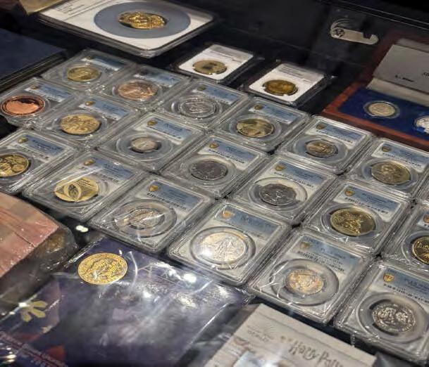 Coins and commemorative pieces are displayed for collectors and enthusiasts at the event