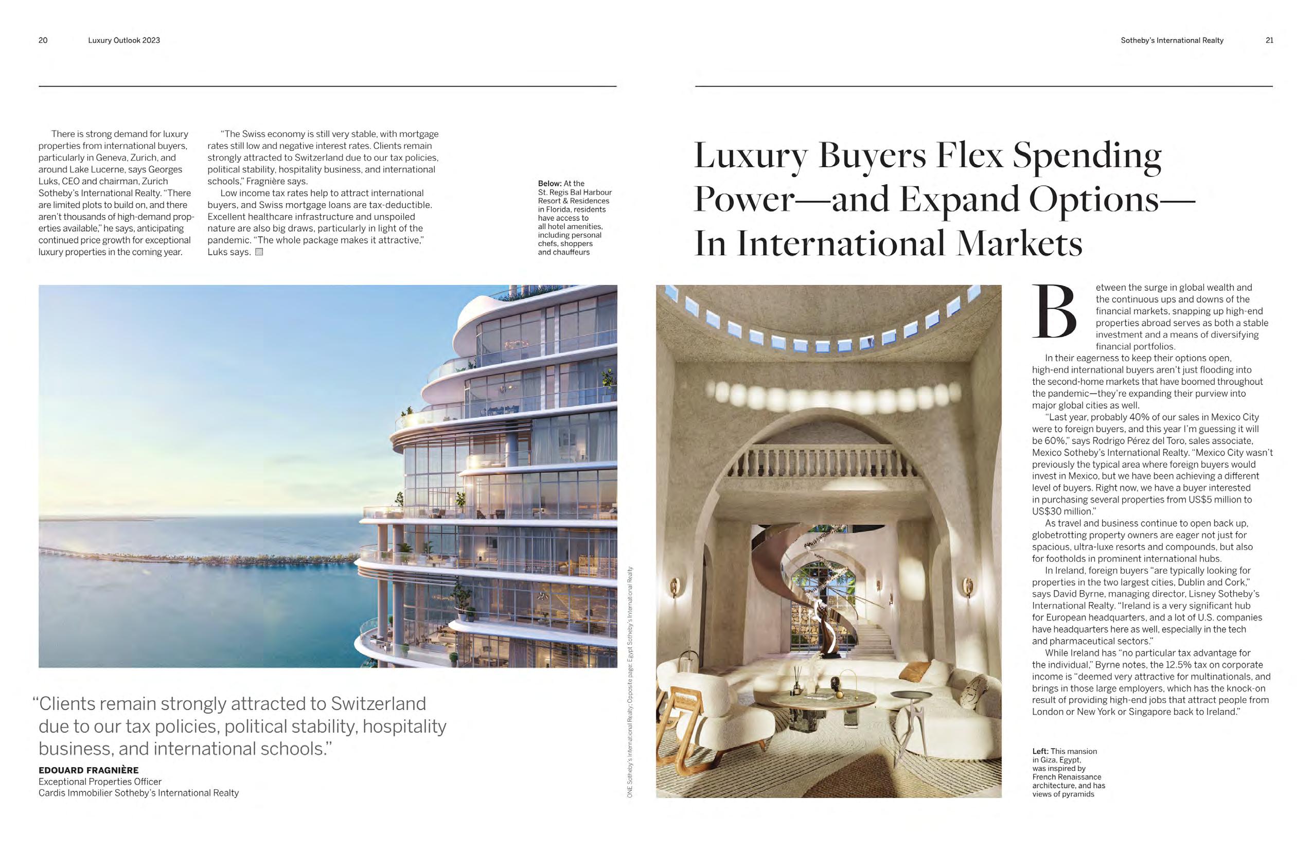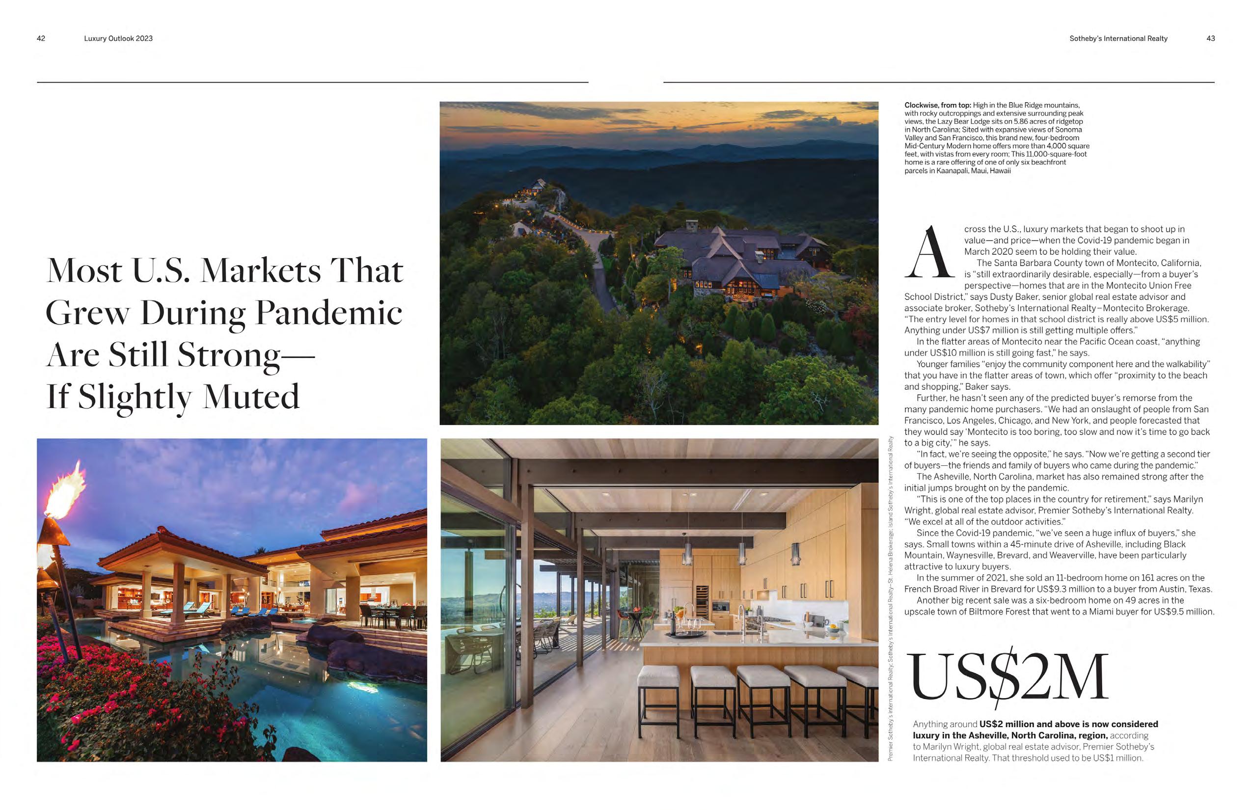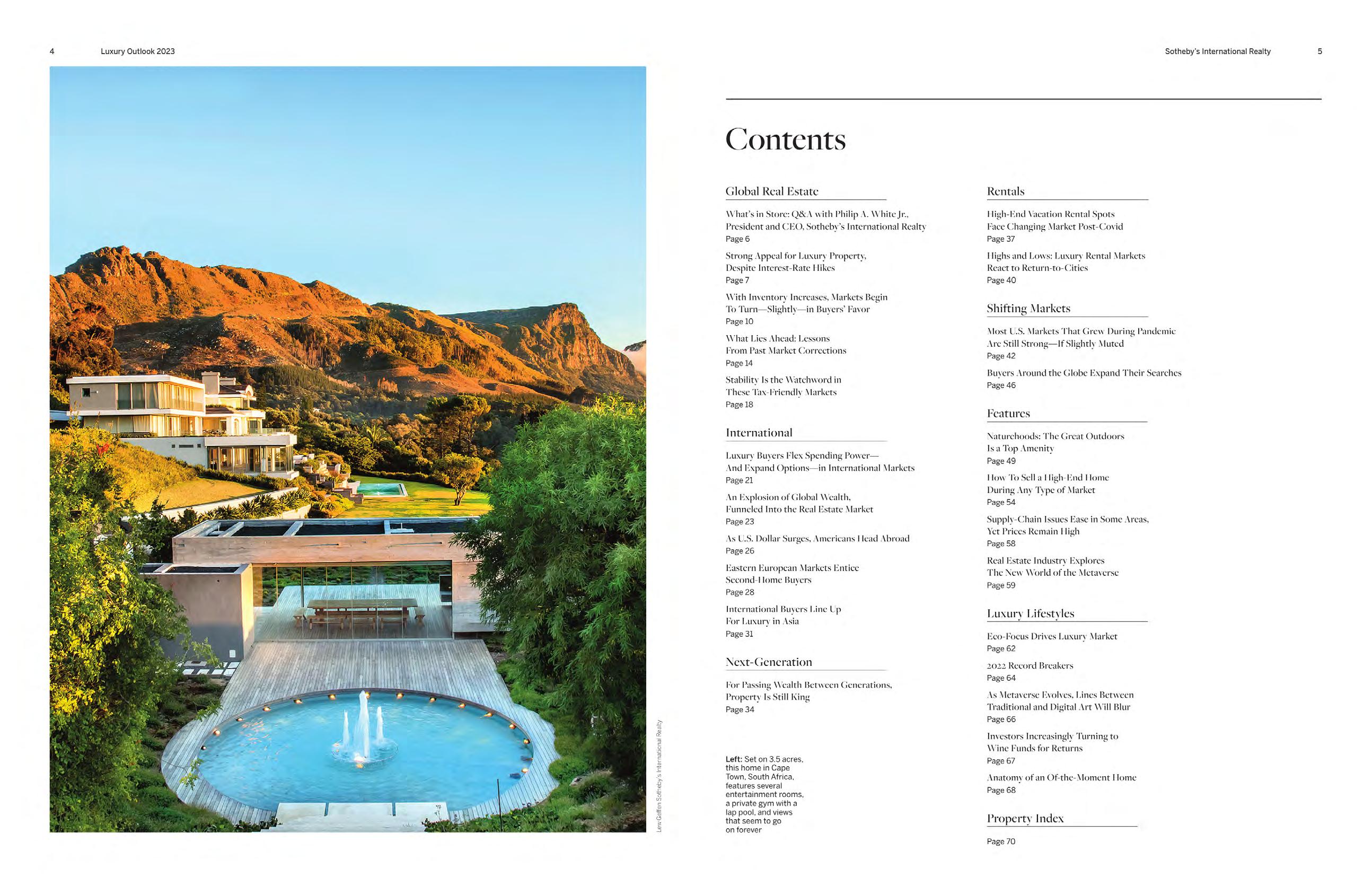 In the pages that follow, we'll also look beyond the real estate sector to see what consumers of luxury goods desire, from sustainable luxury items, to record-breaking auction sales, to wine investments. Now more than ever, we know that the affluent want to spend their equity wisely, and we're here to help them do just that.