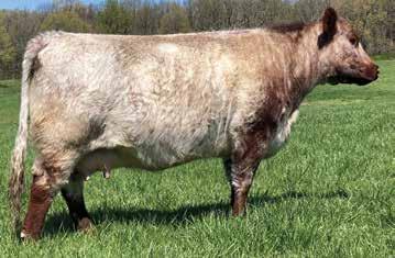 If you want your weaned calves to be heavy then invest in this female. She won’t win any beauty contests but she raises big ones, and has a lot of good years ahead. She has been awarded a Performance Dam Award for superior production. Bred to White Noise to produce a high quality roan, polled calf. Due 2-27-26 to JSF White Noise 42K.