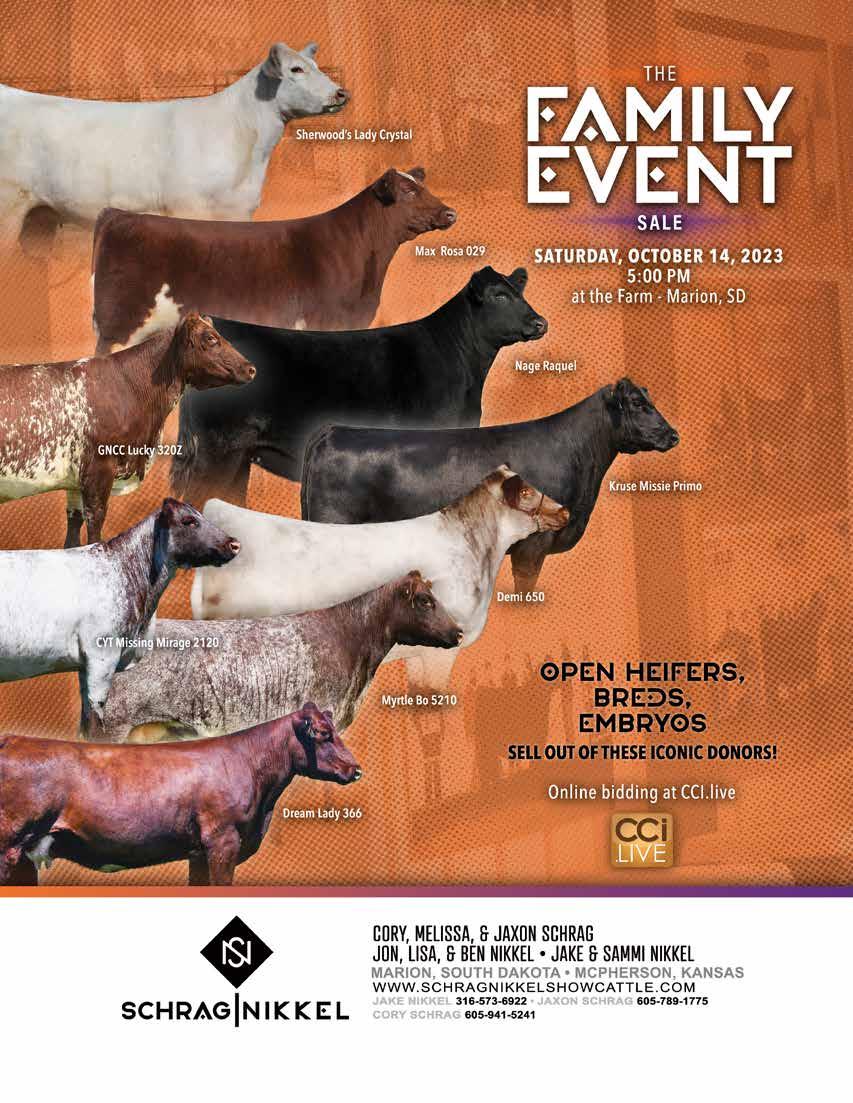 I am a fourth generation Shorthorn breeder. My greatgreat grandfather imported Shorthorns from Russia in the late 1800s. I have continued the family tradition with my wife, Melissa, and my son, Jaxon, along with my daughter, Samantha, and son-in-law, Jake Nikkel. Jake and Sammi were married this past May and we now have joined both family operations to form Schrag-Nikkel Show Cattle and have facilities in Marion, S.D., and McPherson, Kan.”