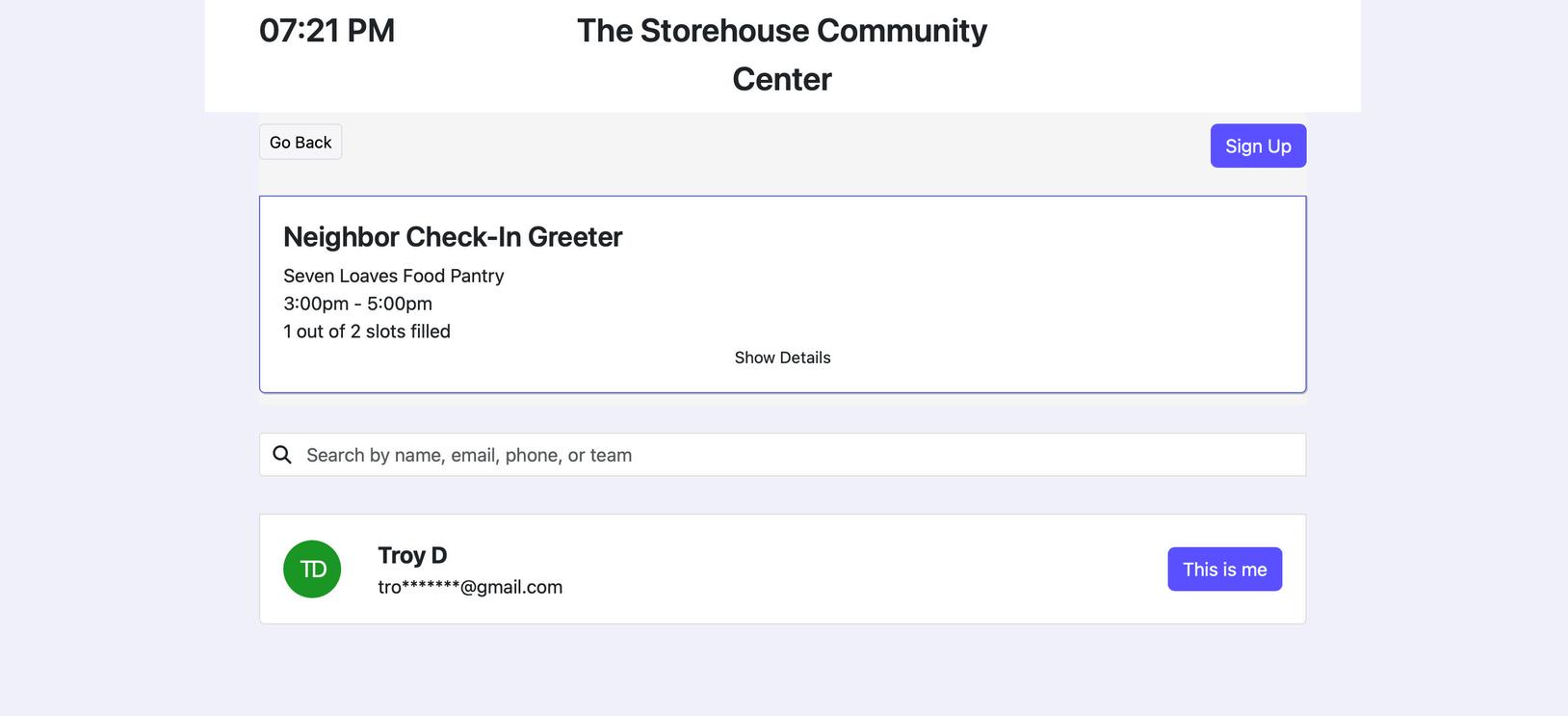 You are on the kiosk page. You can search for the volunteers by their name or by the opportunity they signed up for.