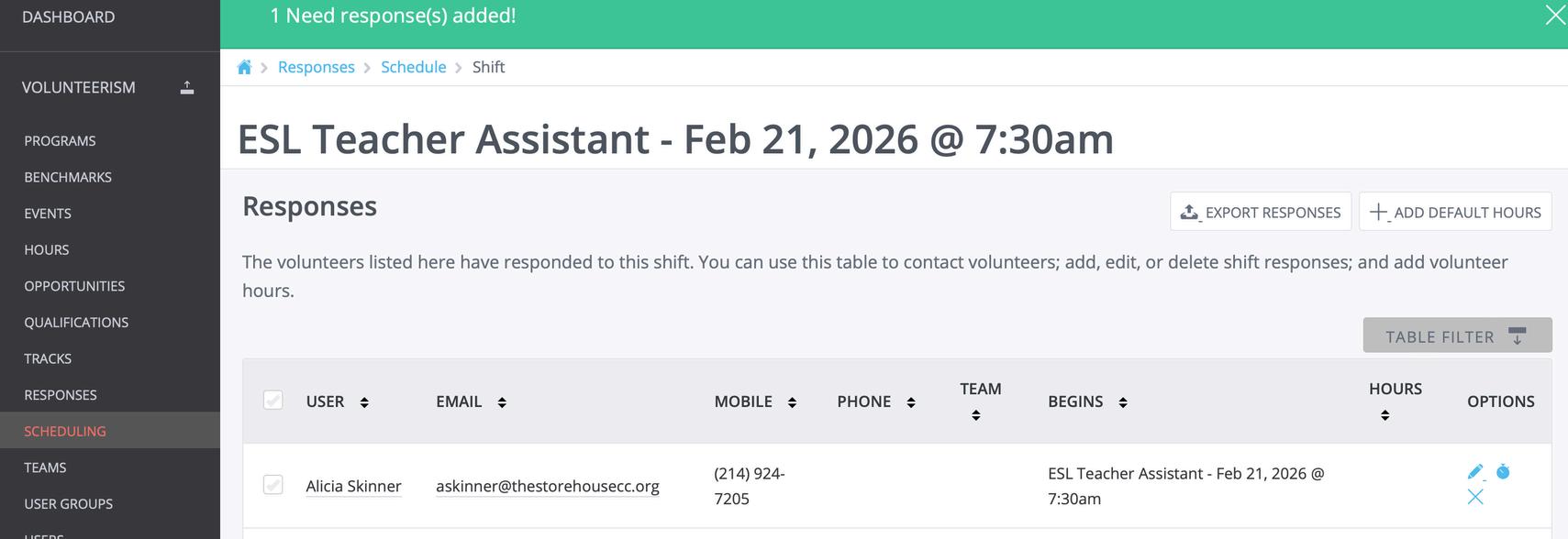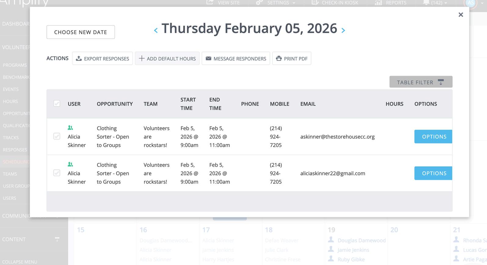 This will show you a list of volunteers for that day along with information such as team (group), opportunity, email. You can use the table filter at the top to control what information you would like to see.