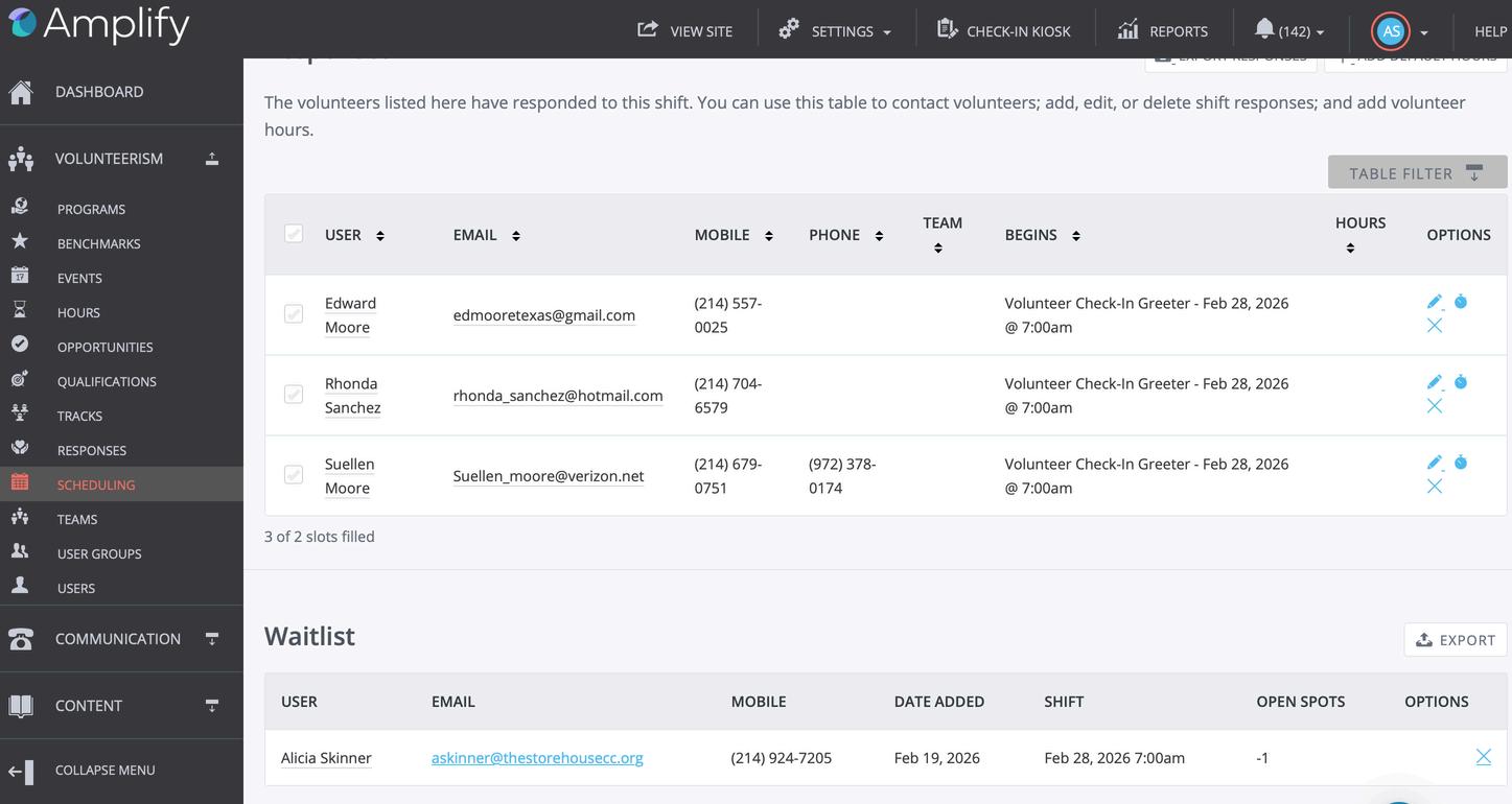 Scroll down on the screen to see the waitlist. You cannot move someone from a waitlist if the maximum number of volunteers has been met. If someone cancels, then the waitlist position can be added if not already added. There will be a plus sign under the options header where you see the user.