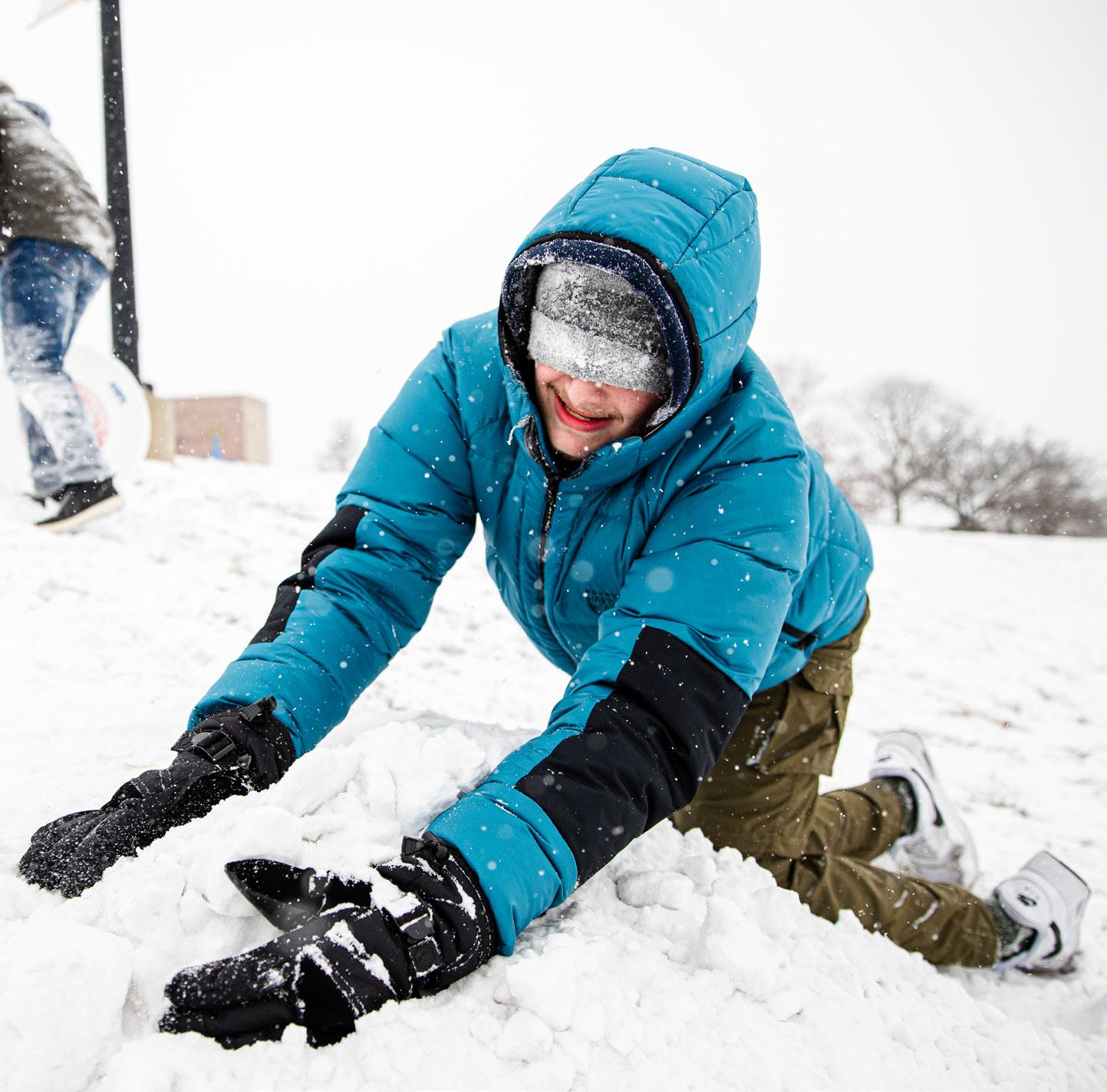 A student builds a ramp out of snow on Jan. 24. At the time, the windchill was around -12 degrees. Photo by Zachary Ruth / The Sunflower