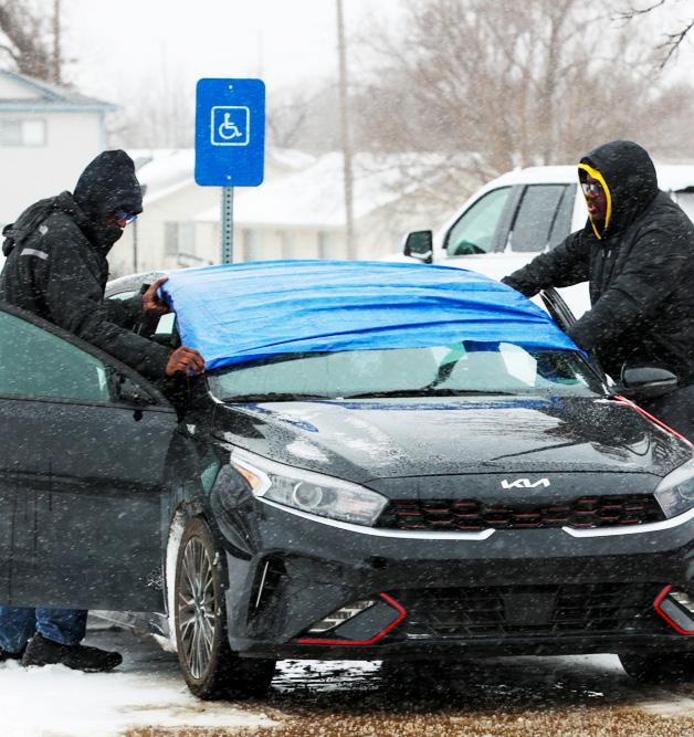 Two men cover up their car’s windshield before the Shockers’ basketball game on Jan. 24. The low on the 24th was two degrees. Photo by Mack Smith / The Sunflower